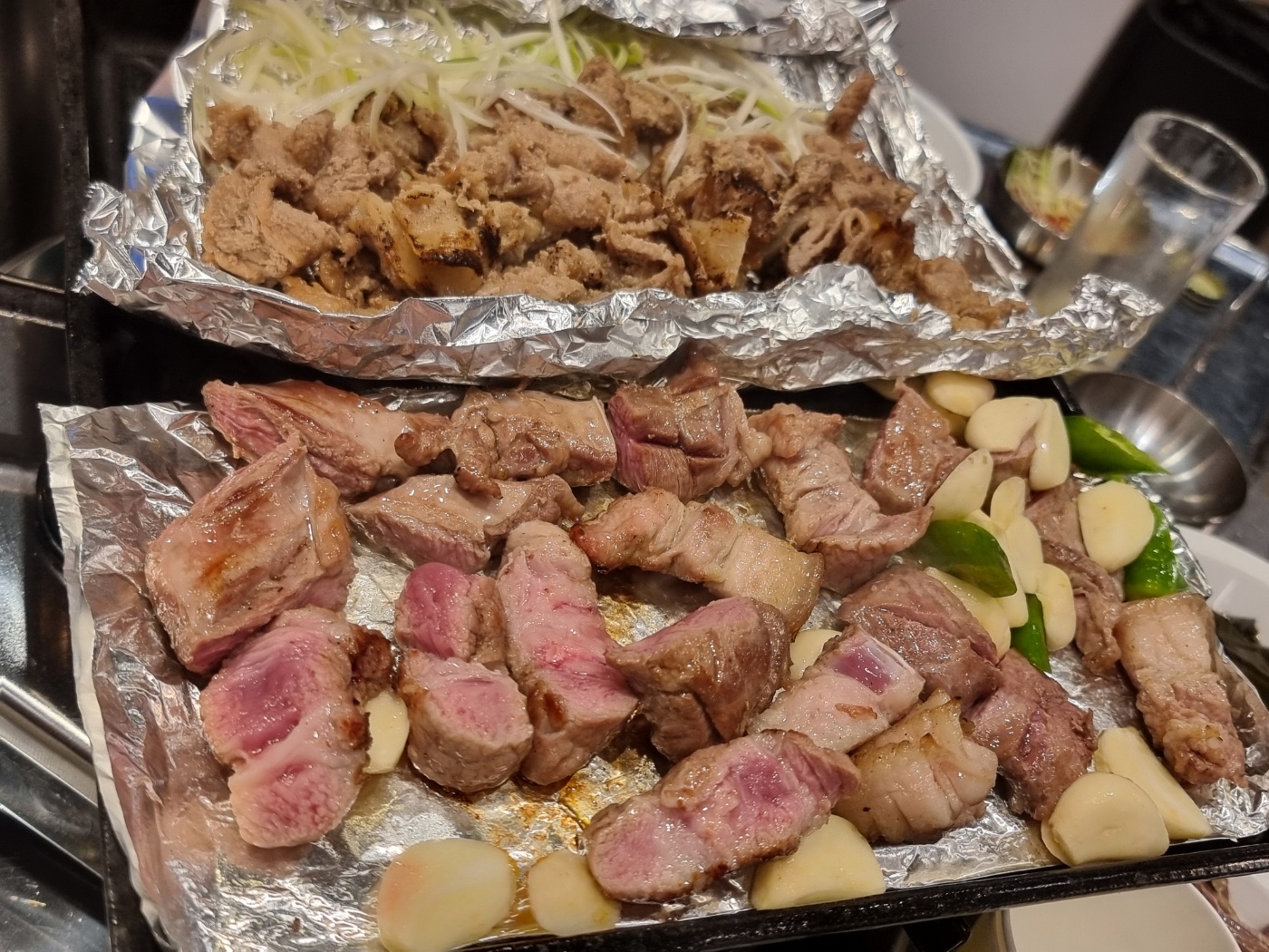 상록수연탄구이 충무로직영점 연탄모둠. 연탄불로 초벌된 오겹살과 목살이 불판 위에 올라가 겉은 바삭하고 속은 촉촉한, 육즙을 품은 고기를 선사해준다. 거기에 연탄향까지 좋다.연탄파불고기도 빼놓을 수 없다. 간장과 고추장 중 선택할 수 있는데, 파채의 알싸함과 연탄불에서 비롯된 불맛이 어우러져 입안 가득 감칠맛을 느끼게 해준다.
