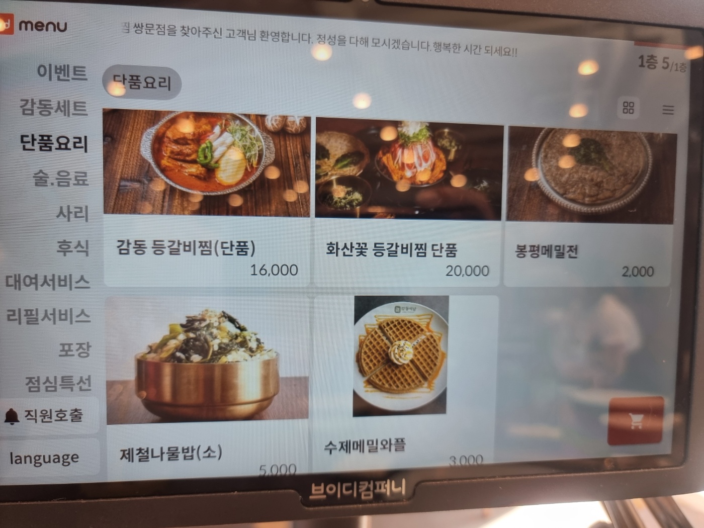 벽면에 곤드레, 유채나물, 고춧가루 농부 사진이 인상 깊다. 산지를 전면에 내세워 재료 정직함을 보여주는 방식, 음식 만드는 과정까지 자세히 소개되어 있어 음식에 대한 기대를 높인다.