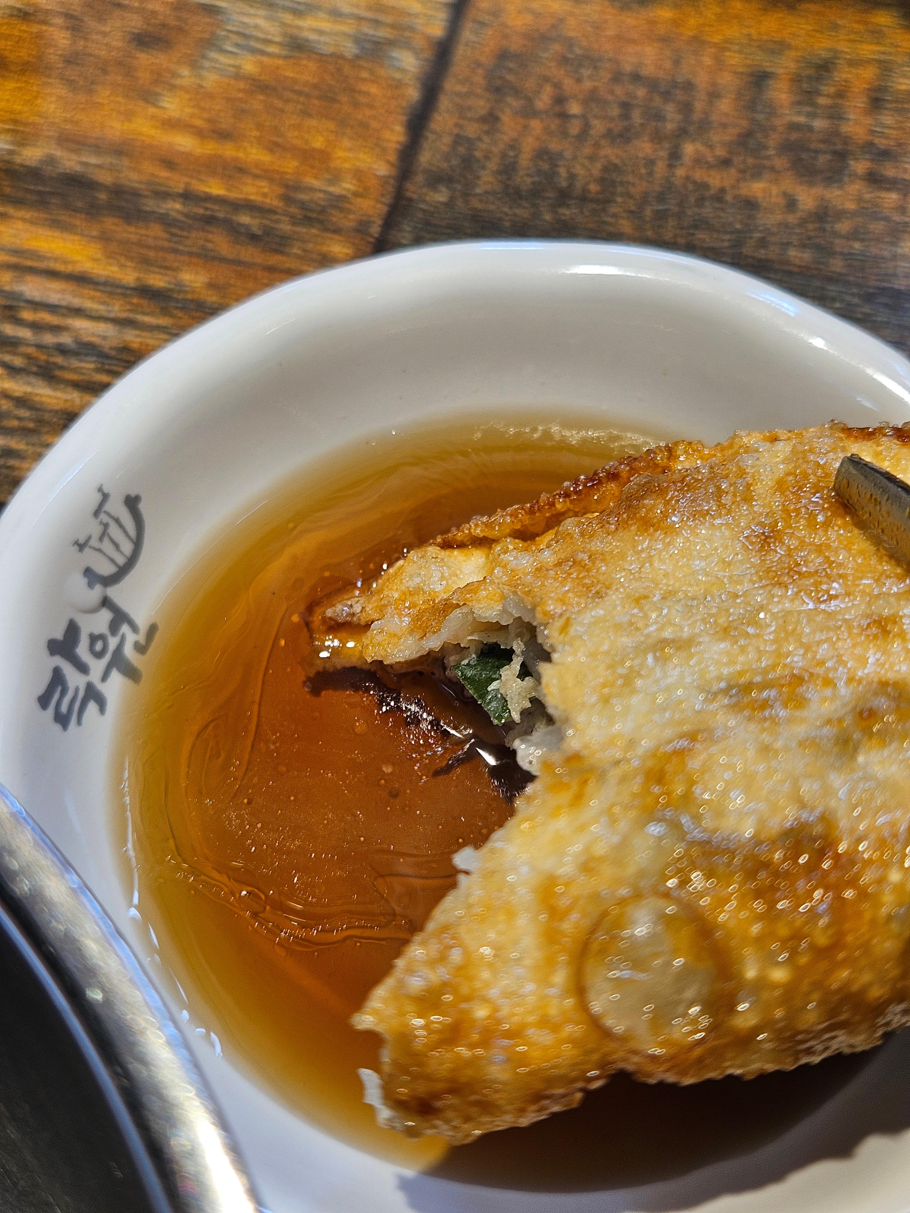 락원이북만두 군만두. 보기만 해도 바삭한 식감이 먹음직스럽다. 한입 물면 바삭 소리가 들린다. 이곳에서 직접 만들었다는 맛간장에 군만두 찍어 먹으니 굿. 찐만두에 나온 고기만두보다 더 양념이 강한데 전혀 부담스럽지 않고 중독성 있는 맛이다. 군만두는 겉은 바삭하고 속은 육즙이 살아있다. 한입 베어 물 때 느껴지는 촉촉함과 고기 탄력이 훌륭하다.