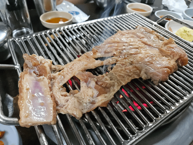 주문한 돼지갈비 첫 접시가 나오자, 직원분이 처음 방문인지 확인하고 직접 한 대 구워주며 시범을 보여주셨다. 테이블 옆에는 돼지갈비와 껍데기를 굽는 방법이 상세히 적혀있다. 첫 한 입에 넣는 순간 대기 시간이 아깝지 않다는 생각이 들었다. 야들야들한 식감에 달콤한 양념이 고기 고소함과 완벽한 조화를 이룬다. 한 점, 두 점 먹다 보니 어느새 접시가 비었고, 또 주문하게 된다. 어느덧 돼지갈비 8인분.