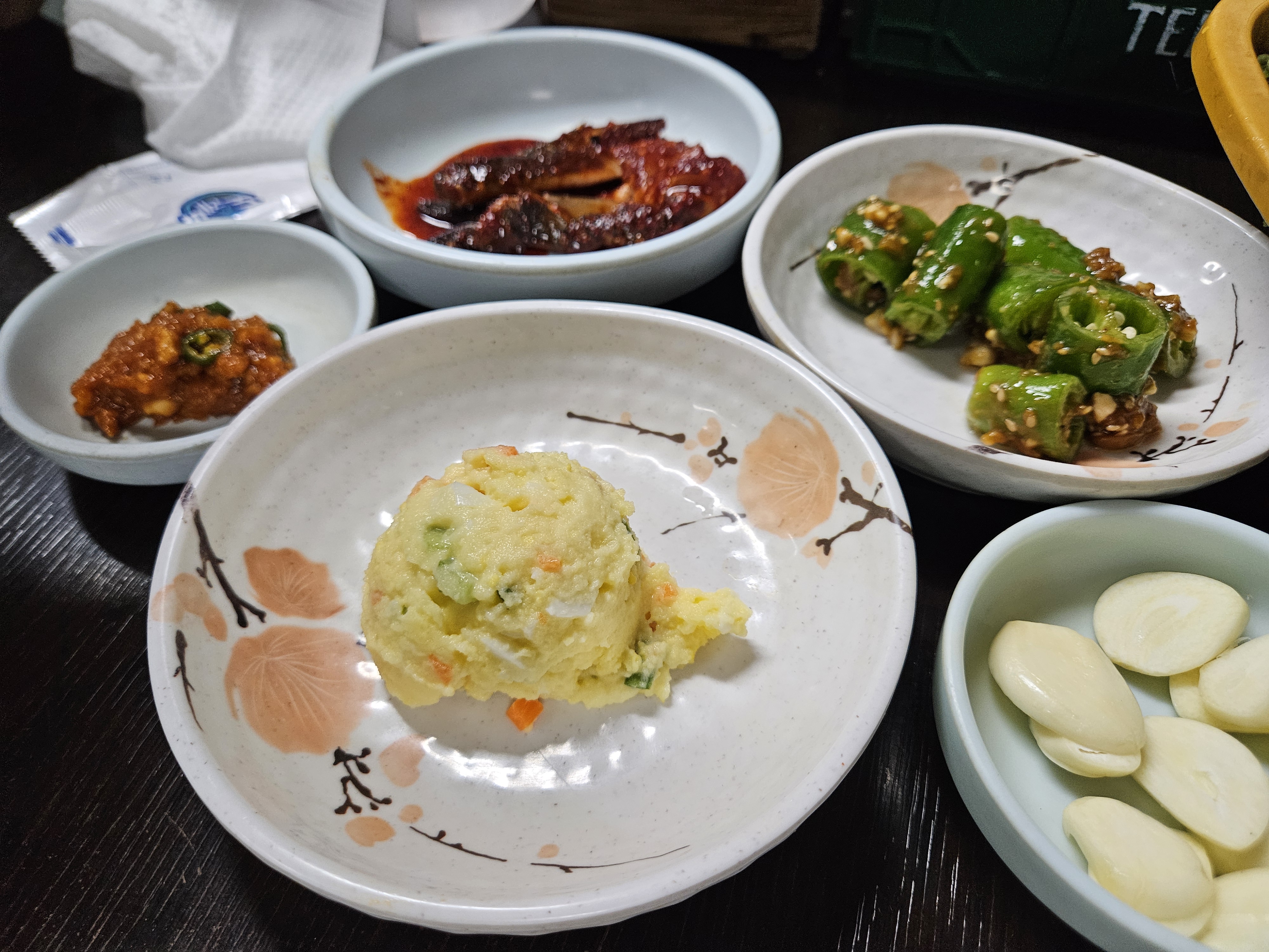 영등포부일갈비 자리에 가보니 반찬이 세팅되어 있다. 우리가 모두 앉자 반대편에도 똑같이 반찬을 추가로 세팅해줬다. 반찬 모두 다 좋다. 상추무침, 된장고추무침. 쥐포, 계란샐러드 굿. 진짜 하이라이트는 양념게장. 셀프 바에 양념게장 있어 눈치 볼 필요 없이 원하는 만큼 가져다 먹을 수 있다. 양념이 예술. 정말 푸짐하게 먹었다.